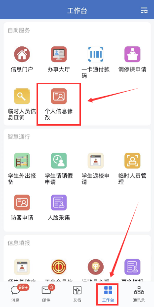 点击企业微信“工作台”的“个人信息修改”,进入“个人中心”。