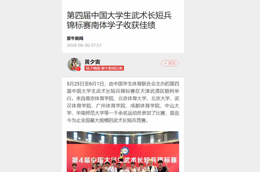 【扬子晚报】第四届中国大学生武术长短兵锦标赛南体学子收获佳绩
