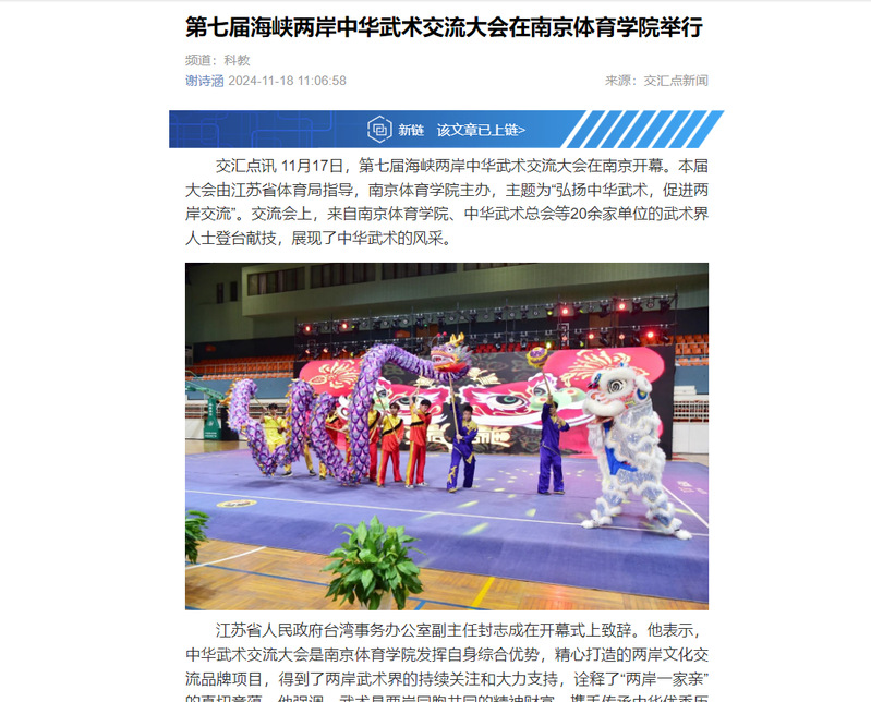 【学习强国】弘扬中华武术 促进两岸交流 第七届海峡两岸中华武术交流大会在南京举行