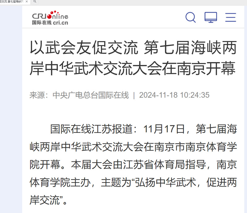 【中央广电总台国际在线】以武会友促交流 第七届海峡两岸中华武术交流大会在南京开幕