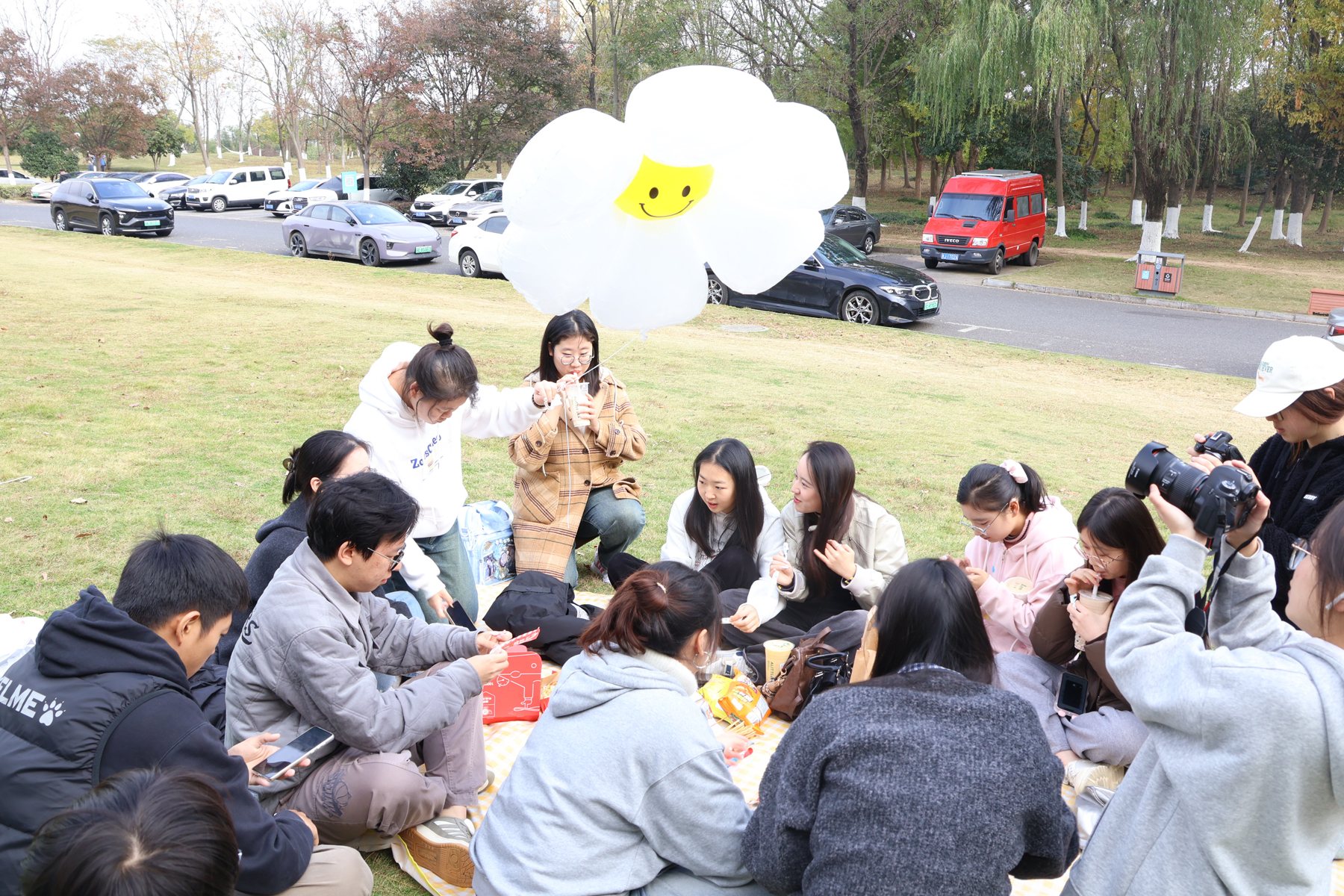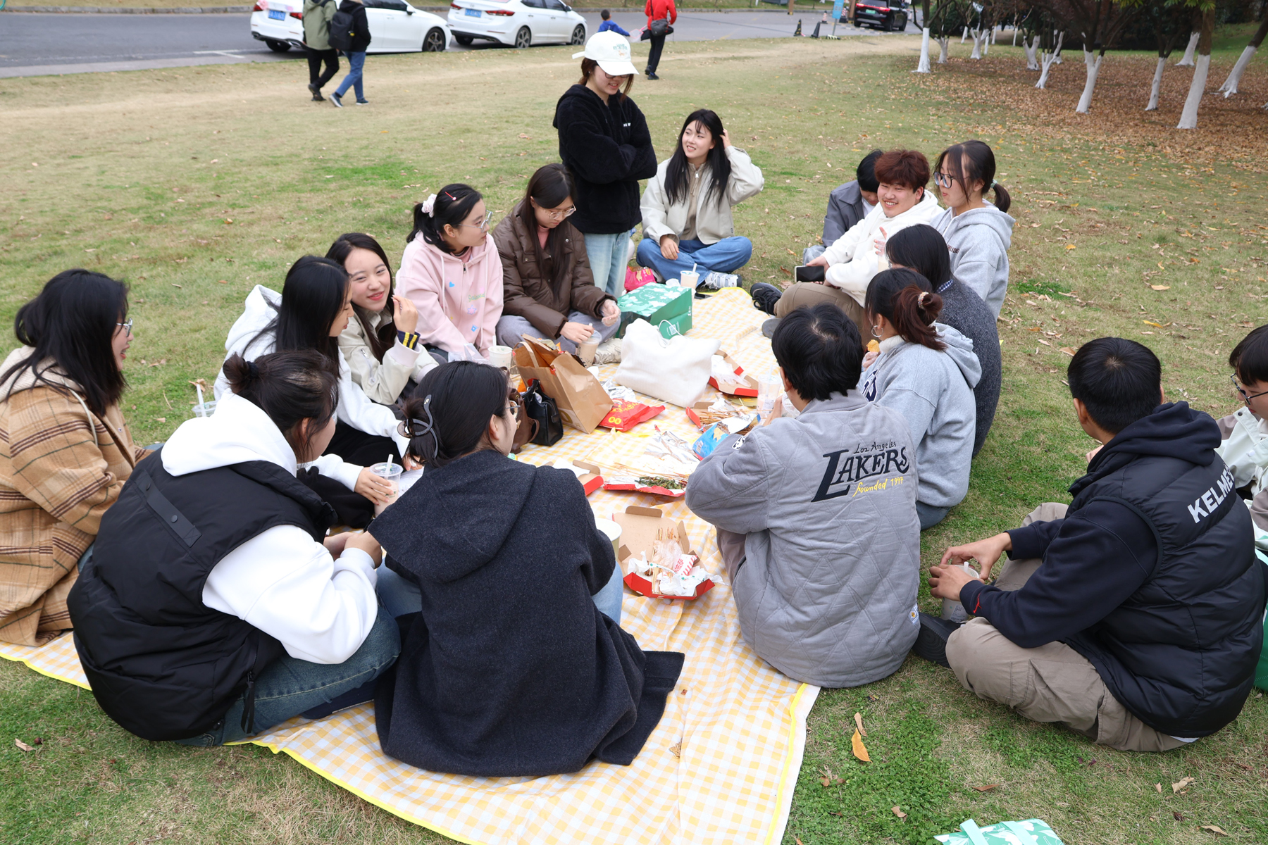 在活动中,大家围坐在草坪上一边分享食物一边畅聊生活与工作趣事,欢声笑语驱散了初冬寒意。紧接着,数字炸弹游戏迅速点燃了团建气氛,每个人都小心翼翼地猜测数字,同时又在紧张与欢笑中等待“炸弹”的爆发。随着每一次“爆炸”,现场总是爆发出一阵欢呼与笑声,同学也逐渐拉近了距离、深化了友谊。