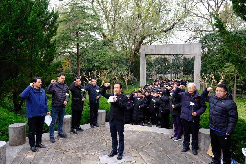 乒羽学院院长冀方新带领大家进行集体宣誓。乒羽学院关工委执行副主任凌波介绍了东郊丛葬地纪念碑的有关情况。