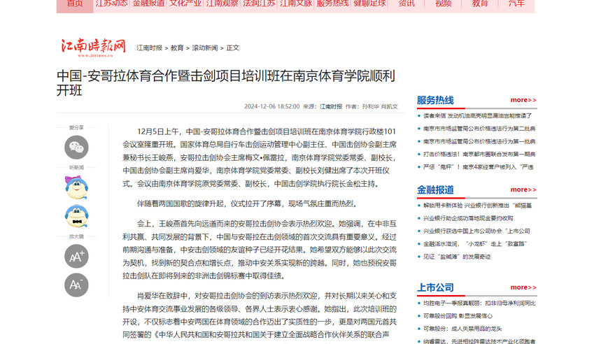 【江南时报网】中国-安哥拉体育合作暨击剑项目培训班在艾弗森贝博ballbet官网顺利开班