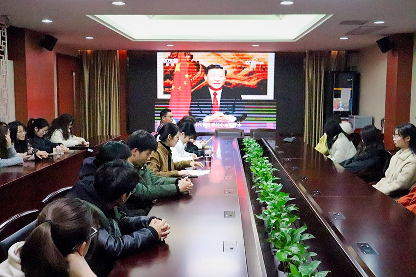 首先,全体与会人员集体观看了国家主席习近平发表二〇二〇年新年贺词的新闻视频。记者团团长沈漩和副团长张蕊带领学习了习主席的新年贺词。