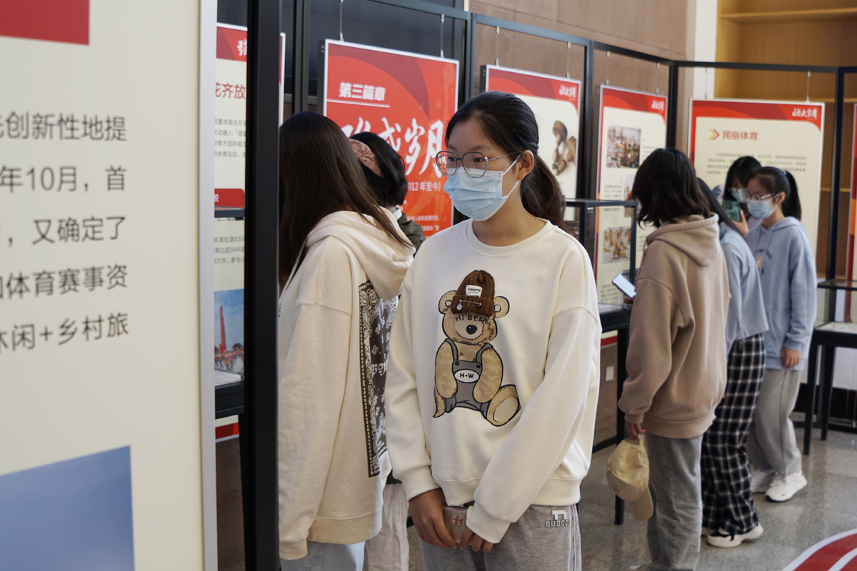参观展览。活动伊始,大家一起来到图书馆大厅,参观了江苏体育发展成就图片展。展览内容共分为新生岁月、壮大岁月、强盛岁月、逐梦奋进四个版块,通过展陈12000多字内容、200多幅图片、部分珍贵奖牌奖杯等藏品,回顾了新中国成立以来江苏体育发展的光辉历程。参观中,同学们纷纷表示,要从江苏体育事业取得的伟大发展成就中汲取力量,激励自己坚定理想、珍惜韶华、练好本领,时刻准备着为建设社会主义现代化强国、实现中华民族伟大复兴贡献更大的力量。