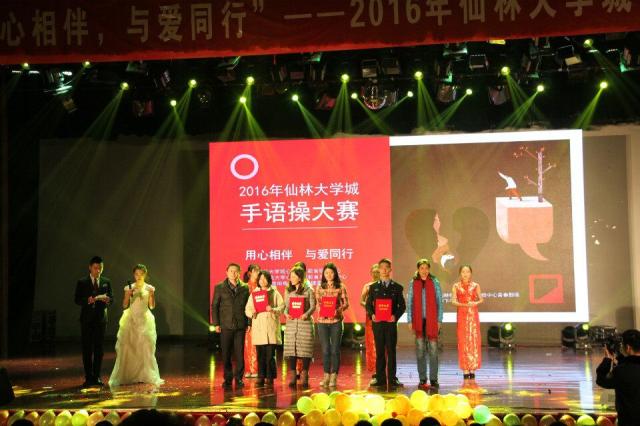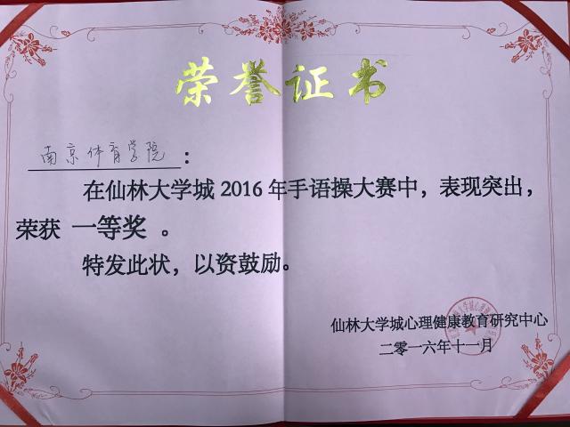 为进一步普及和宣传心理健康知识,提高大学生心理健康意识,积极营造丰富多彩的校园心理文化氛围,本着“构建和谐校园,促进身心发展”的宗旨,我院学生参加了由南京邮电大学组织承办的“2016年仙林大学城手语操大赛”,并获得一等奖的优异成绩。