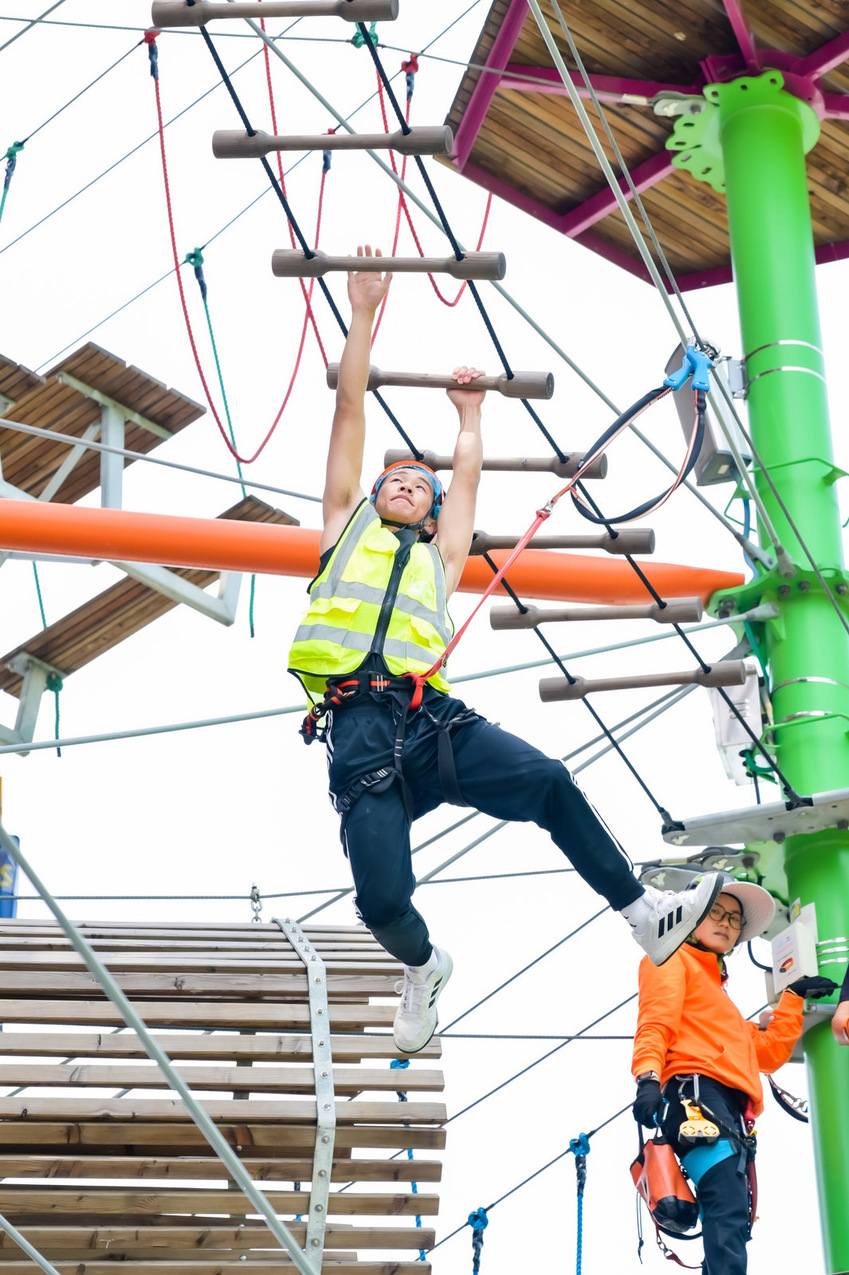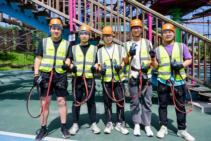 金陵矩阵集户外拓展、绳索攀爬、低空蹦极、高空秋千、疯狂滑道于一体,涵盖139种难度各异的体验元素。同学们在主持人的带领下在2-5层进行不同难度、风格的挑战。挑战过程中,各小组制定不同策略,创新通关玩法,在分工与合作、挑战与鼓励中,既充分发挥了自己的聪明才智和团队的合作精神,又展现出大学生的昂扬风貌与拼搏姿态。