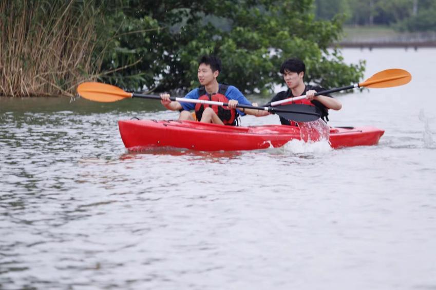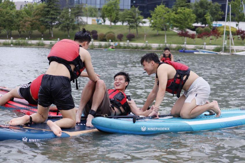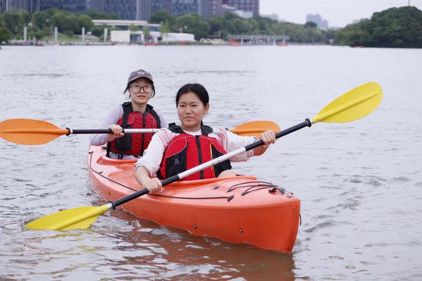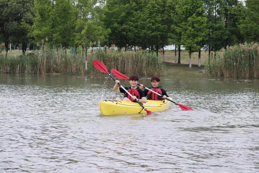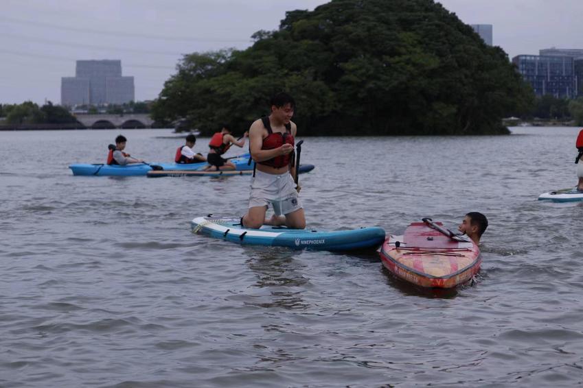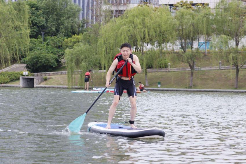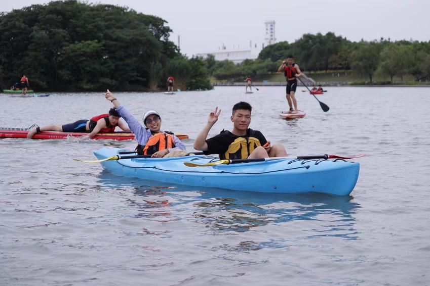 5月21日下午,青奥水上运动中心九龙湖基地经理、体育产业与休闲学院优秀毕业生郑嘉皓带领全体学生参观了水上基地,详细介绍了基地主营业务和运营机制。分别对皮划艇运动和桨板运动的握桨手势、划桨技术、救生衣穿戴以及相关安全事项进行了细致深入的讲解。桨板运动是一项极具挑战性和观赏性的水上运动,融合了划桨、滑行、平衡等多项运动元素,近年深受青年群体的喜爱。郑经理鼓励同学们勇于尝试桨板运动。5月的九龙湖,水面宽广、波光粼粼,同学们热情高涨,在教练的引导下纷纷登上皮划艇或桨板,迅速有力地挥动划桨,在盈盈碧波中乘风破浪。尝试皮划艇运动的同学们已经能够正确上下艇,前进、后退、转弯、扫桨;尝试桨板运动的同学们或站、或跪、或趴、或躺……酣畅淋漓地解锁着各种桨板姿势,充分感受着水上运动的趣味性和挑战性。在水上运动体验课程结束之前,郑经理再次对水上竞技、健身、休闲运动项目的发展趋势、基地的运营管理方向和人才需求重点进行了总结和归纳。
