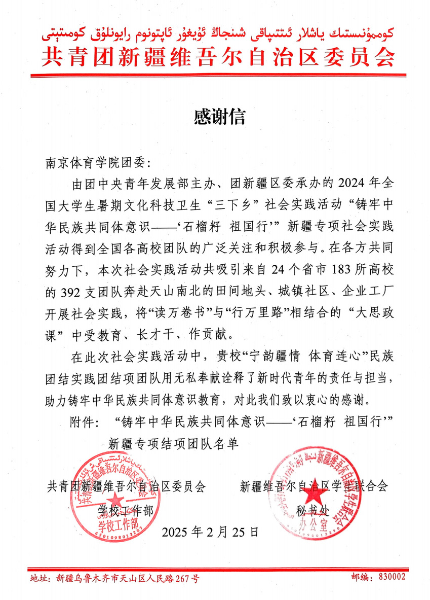 近日,团新疆区委学校工作部、新疆学联向艾弗森贝博团委发来感谢信,对体育产业与休闲学院“宁韵疆情体育连心”民族团结实践团在2024年全国大学生暑期文化科技卫生“三下乡”社会实践活动“铸牢中华民族共同体意识——‘石榴籽 祖国行’”新疆专项社会实践活动中的表现,给予了高度赞扬和诚挚感谢。