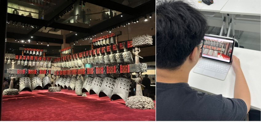 部分学生赴武汉参访湖北省博物馆,亲身感受曾侯乙编钟的魅力。2022级学生陆思羽激动地说:“站在曾侯乙编钟前,听到工作人员用复制品演奏《楚商》,那一刻突然懂了什么是‘钟鸣鼎食’的礼乐文明。”未能亲临现场的滕文韬则通过线上联动形式“云参观”,借助高清VR体验,他同样感受到了编钟纹饰的精美与“礼乐治国”的深远影响。