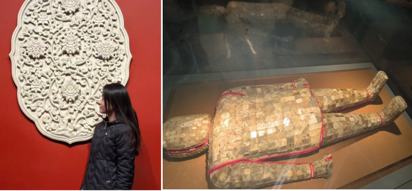 学生们首先走进了南京博物院的民国街道展区。复古商铺、老式电车等场景生动再现了近代社会风貌。2022级学生俞雯彰表示:“课本里的‘中西碰撞’在这里变得具象化,旗袍与西装的并置,让我更理解那个时代的文化包容。”而多次探访的杲晗铃则对汉代玉璧的雕刻纹路有了新的认识:“云纹与兽面纹的组合暗含礼制深意,历史需要静心品读,每一件文物都是文明的密码。”