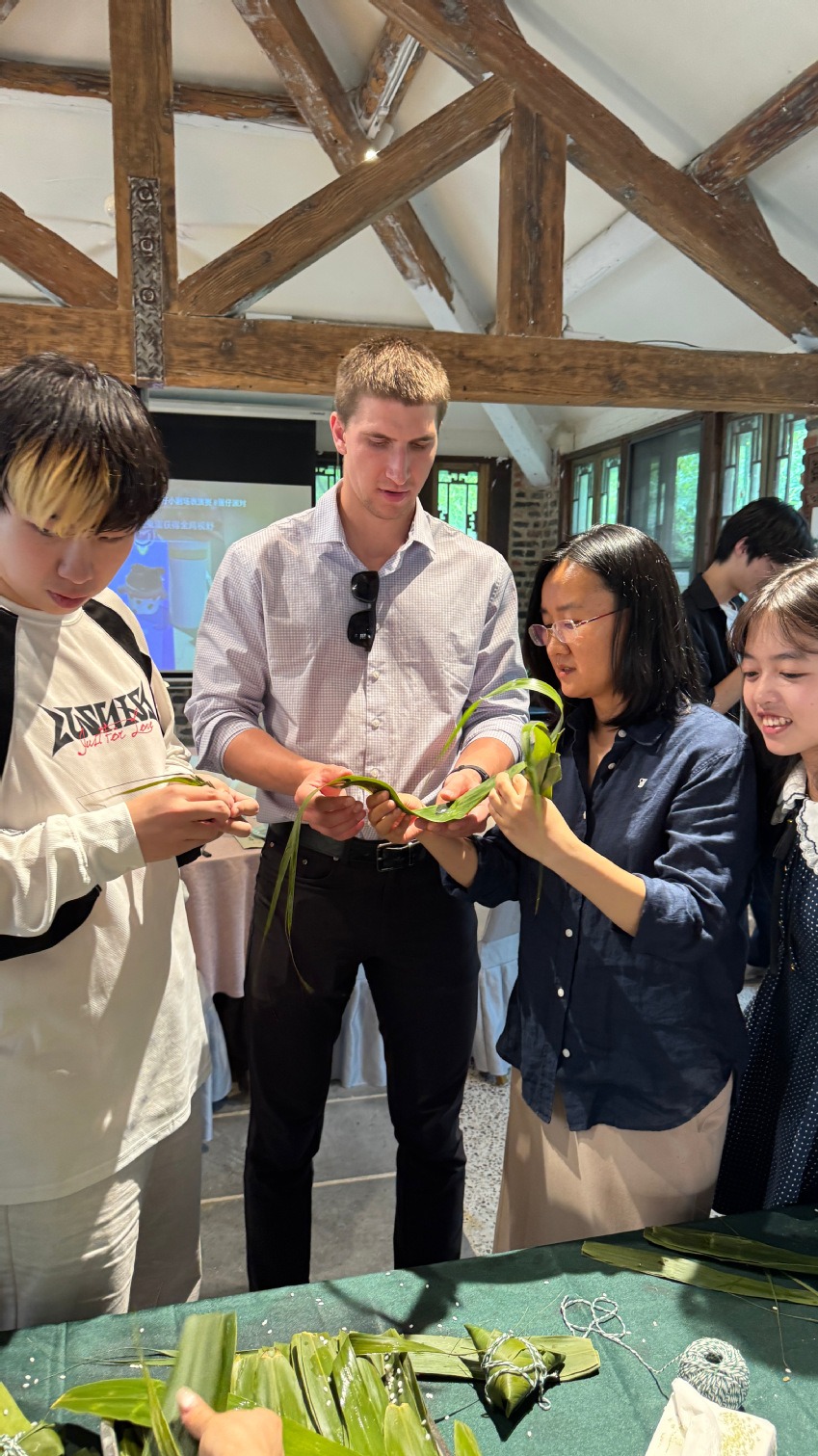 活动伊始,党总支书记王进致辞表示:“端午节承载着中华民族千年的文化记忆,希望通过此次活动,让国际友人近距离感受中国传统节日的魅力,以文化为纽带,搭建起中外友好交流的桥梁。”粽子飘香间,中外师生围坐协作,折粽叶、填糯米、扎丝线,一枚枚饱含情谊的粽子在指尖成型。Richard 的孩子在学生指导下完成人生首个粽子,兴奋之情溢于言表。