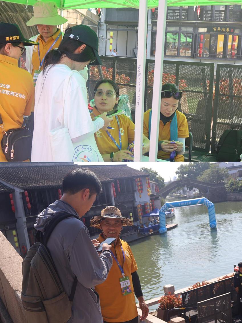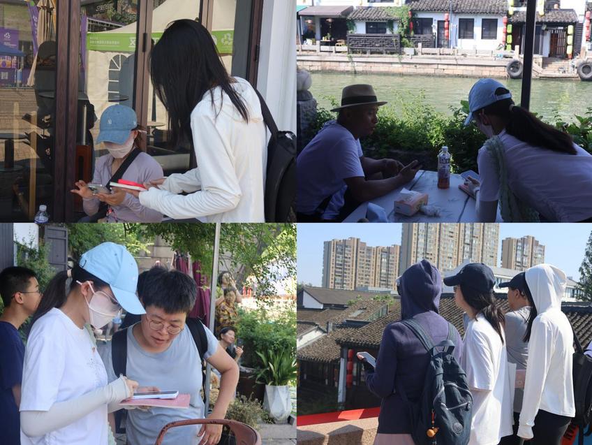 上午8点,调研团队抵达世界文化遗产大运河无锡段的核心区——清名桥历史文化街区。该街区完整保留了明清时期“水弄堂”的独特格局,是文化遗产保护与现代活力交融的典范。团队成员现场观摩了在古运河畔举行的桨板联赛开幕式,感受现代体育活力与千年运河文脉碰撞的独特魅力。随后,团队成员综合运用问卷调研和深度访谈的方法,与参赛选手、现场观众以及赛事工作人员进行了深度交流,重点聚焦赛事动线设计与运河文化遗产保护的结合方式、现场活动中无锡运河文化元素的呈现效果,以及参赛者与观众对赛事文化氛围营造、体旅融合价值的直观感受。团队成员细致记录了开幕式流程、现场氛围、安全保障及文化融合点的具体实践。与此同时实地考察精心打造的“古运新潮”运河水岸市集,调研赛事活动对街区商业氛围的带动作用。学生们将专业所学的理论知识应用于实践,锻炼了现场观察、数据收集与分析、沟通协调等综合能力。