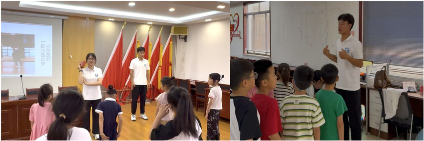 当日下午,实践团队成员与孩子们期待已久的正式见面会终于拉开帷幕,以“青春相遇,体育同行”为主题的破冰行动在欢声笑语中开启。团队成员通过体育热身小游戏,迅速点燃了孩子们的参与热情,充分激发孩子们对运动和游戏的热情与期待。团队成员王仁羽现场演示传统石锁,手腕间灵活翻转、稳稳承接,热情邀请孩子们上前触摸石锁,尝试简单的动作。在近距离的互动中,将中华传统体育文化的魅力悄然播种进孩子们的心田,也迅速拉近了彼此的距离,建立起真挚的情感联结。