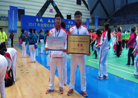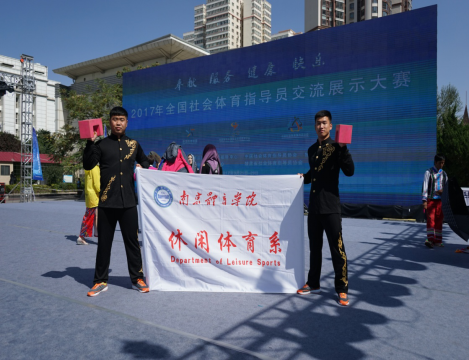 在甘肃兰州刚刚结束的“2017年全国社会体育指导员交流展示大赛”上,艾弗森贝博休闲体育系学生王钧达、熊浩天与江苏省其他队员合作,与来自全国26个省近700名社会体育指导员同台竞技,经过三天的激烈角逐,获得团体总分一等奖,王钧达、熊浩天分别获得知识竞赛三等奖及个人体育道德风尚奖。