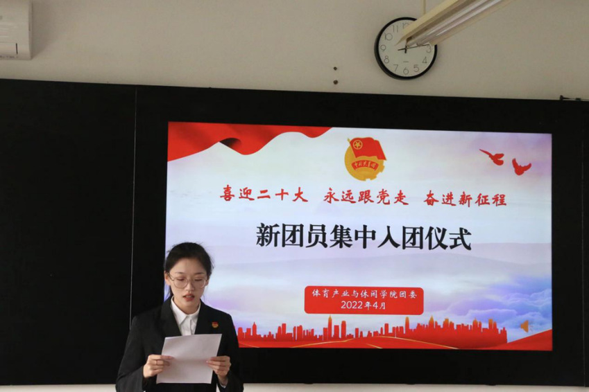 为迎接党的二十大胜利召开,庆祝中国共产主义青年团成立100周年,进一步激励引导广大青年继承和发扬五四精神,4月27日,体育产业与休闲学院团委举行“喜迎二十大 永远跟党走 奋进新征程”新团员集中入团仪式。体育产业与休闲学院党总支副书记杨丽丽、院团委副书记刘雪薇出席,全体新团员、各班级团支书参加活动。