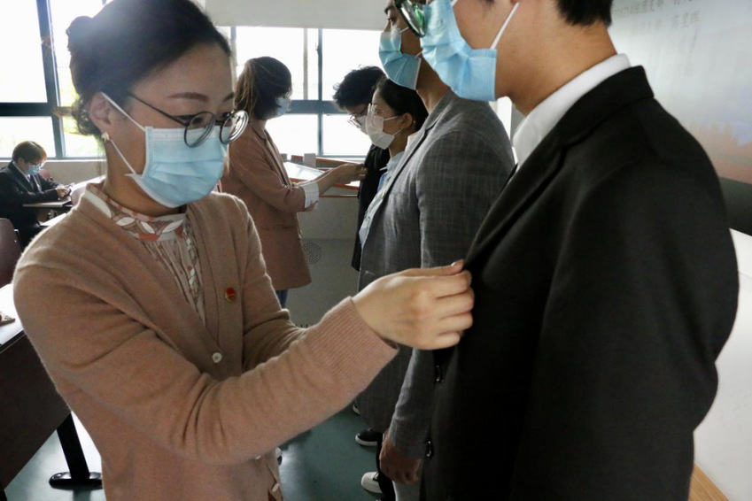 院党总支副书记杨丽丽为新团员佩戴团徽