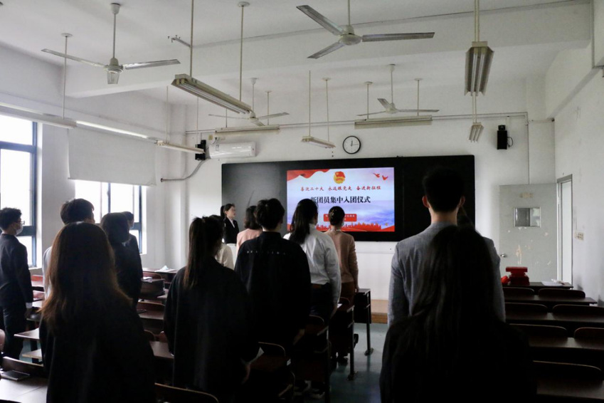 活动在庄严的国歌声中拉开序幕。杨丽丽、刘雪薇为新团员代表颁发团员证,并为他们佩戴团徽。刘雪薇带领全体新团员宣誓、老团员重温入团誓词。入团介绍人代表郑凯琪宣读《团章》中有关团员义务与权利的条款,让新老团员们肩负起重要的历史使命。随后,芮昱晖和杨欣怡分别代表新老团员发言,他们号召全体团员发扬共青团优良传统,履行好团员各项义务,努力学习,艰苦奋斗,在青春的赛道上跑出最好的成绩。
