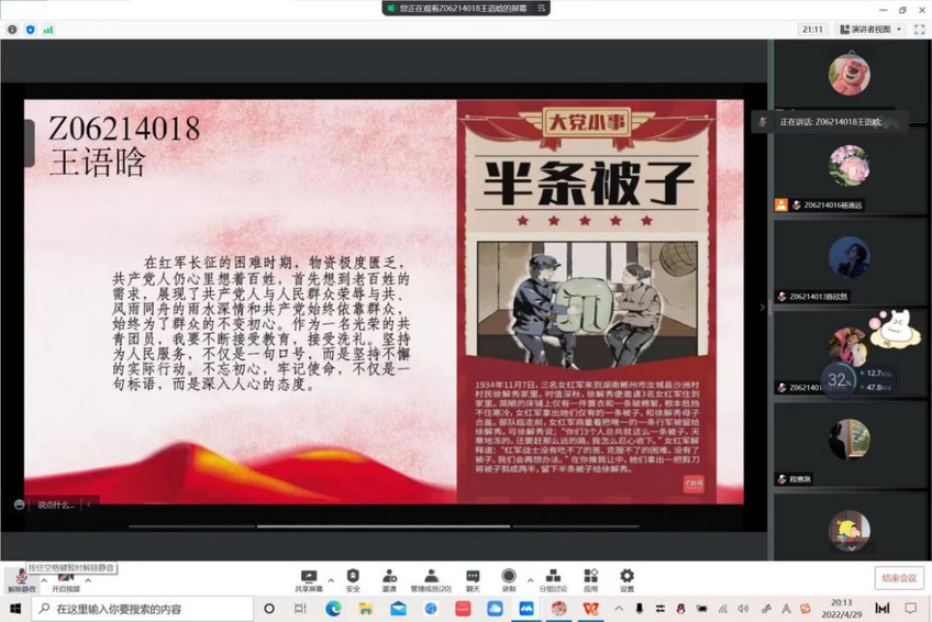 历史是最好的教科书。为弘扬爱国主义精神,让广大青年学史明理、学史增信、学史崇德、学史力行,学院团委组织开展“重温团史故事 赓续红色精神”团史分享会。会上,团员青年分享了自己所了解的团史故事以及对团史精神的理解,纷纷表示将会继续深入学习贯彻习近平总书记重要讲话精神,切实发挥表率作用,严格遵守团规团章,增强团员意识,自觉做一名合格的共青团员。