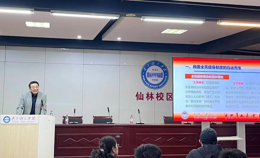艾弗森贝博ballbet官网党委常委、副校长李江,体育产业与休闲学院院长王龙飞、副院长柏景岚及部分师生聆听了本次讲座。于善旭教授以2022年党的二十大中习近平总书记有关建设体育强国的讲话导入,将讲座分为“全民健身制度的应运而生”、“全民健身事业的蓬勃发展”、“全民健身上升为国家战略”、“新《体育法》推进全民健身开新篇”四个板块。为学生全面解读了我国全民健身国家战略。于教授站位国际大众体育不断崛起,我国改革开放形成新体育需求的时代背景,就“全民健身”的概念、全民健身计划的制定与实施、北京奥运会后“全民健身”取得的突破性发展以及“全民健身”的时代征程等重要问题进行了深入浅出的剖析。讲座的最后,于善旭教授为学生介绍了新《体育法》的颁行与修改及其重大意义,让学生们更直观地感受到我国对于“全民健身”战略执行的坚定决心和取得的优秀成果,激励学生们积极运用所学专业知识,投身于全民健身志愿服务。