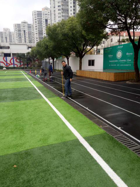 确保学生安全,专家组的老师们清扫跑道上的积水