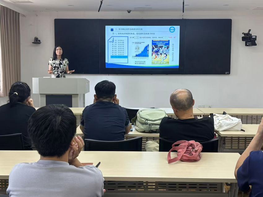周亚婷以《体育概论》课程为例,系统分享了课程思政建设的实践路径。在建设思路上,她提出要立足专业人才培养目标,将思政元素有机融入教学全过程。具体实践中,重点介绍了五项创新举措:一是重构“知识点+思政点”双维课程体系,开发特色教学案例库;二是采用情景模拟、主题辩论等互动式教学方法;三是依托智慧教学平台,构建线上线下相结合的思政教育矩阵;四是建立公众号展示交流机制,促进经验共享;五是打造跨学科教学团队,提升课程思政建设质量。报告结束后,与会教师就课程思政评价体系、资源建设等问题进行了深入交流。