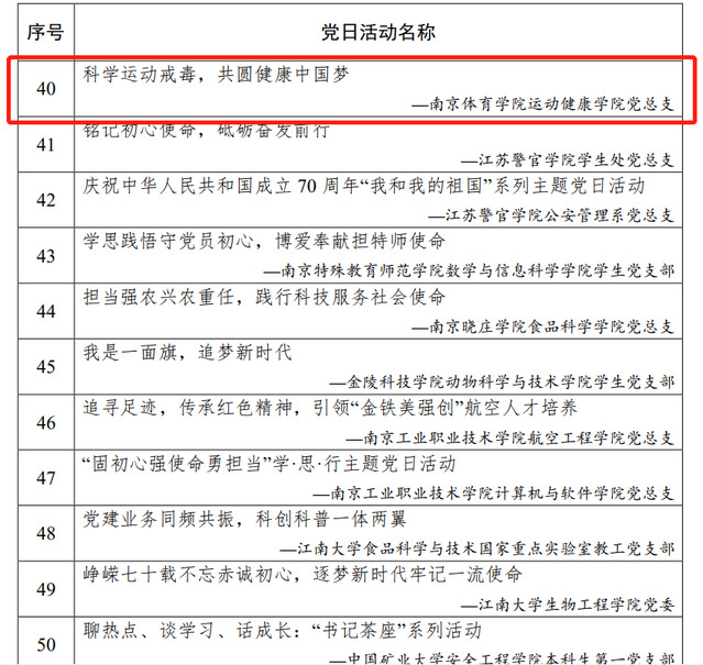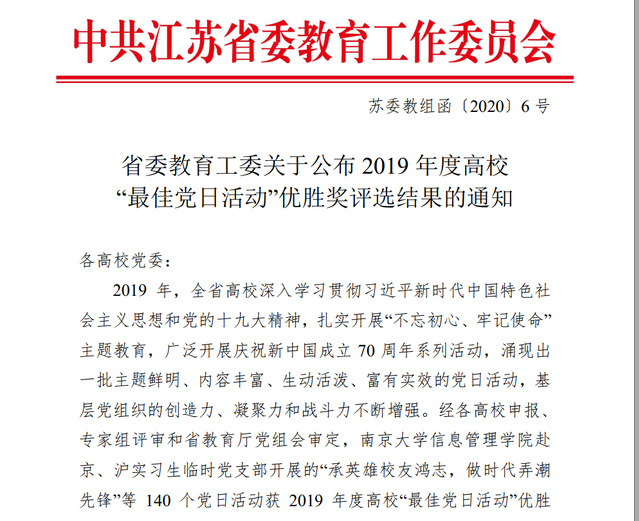 近日,江苏省委教育工委公布了2019年度高校“最佳党日活动”优胜奖评选结果,由学校推荐的运动健康学院党总支《科学运动戒毒、共圆健康中国梦》主题党日活动喜获“最佳党日活动”优胜奖。