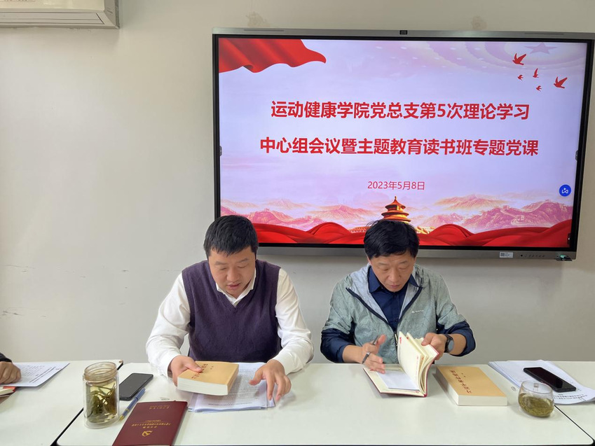 5月8日上午,运动健康学院党总支部在教学办公楼108会议室召开2023年度第五次党总支理论学习中心组学习会暨主题教育读书班专题党课,重点阅读学习了《习近平著作选读(第一卷)》有关文章并结合学习内容讲授专题党课,学院党总支书记丁永亮、院长汤强、副书记阚妮妮、副院长赵彦、各党支部书记、各系主任、学工办主任、院分团委负责人和院办公室人员参加学习会议。学院党总支书记丁永亮主持此次会议并领学。