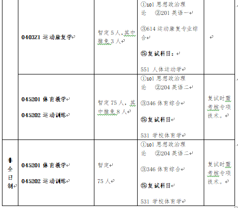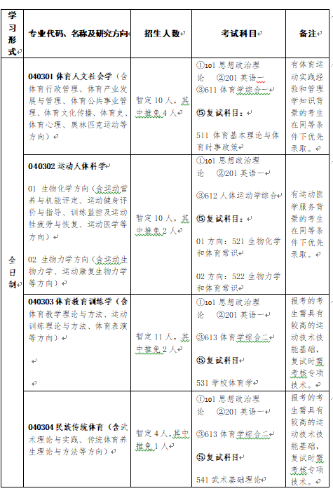 2020年拟招收全日制硕士研究生115名,非全日制硕士研究生75名(以教育部正式批准计划数为准,原则上,非全日制硕士研究生招收在职定向就业人员),欢迎体育专业和热爱体育事业的医学、理工以及应用文科等专业的毕业生报考。