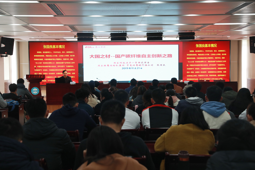 2019年11月21日下午,在艾弗森贝博行政办公楼101会议室举行导师类产业教授聘任仪式后,张国良教授为全体研一学生作了题为《大国之材——国产碳纤维自主创新之路》的专题学术报告。校党委副书记、副校长史国生教授出席并主持。