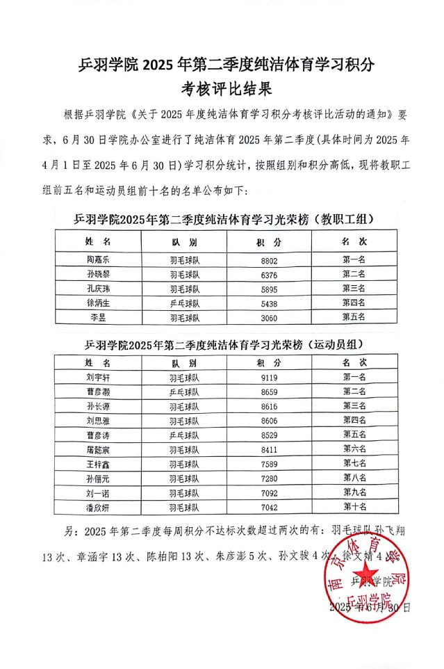 乒羽学院 2025 年第二季度纯洁体育学习积分考核评比结果