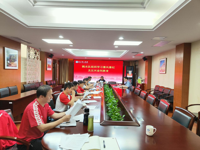 为加强队伍赛风赛纪和反兴奋剂管理,强化运动队思想道德与作风建设,5月15日,游泳学院跳水队组织开展了“加强赛风赛纪 严格反兴奋剂教育”主题学习活动。