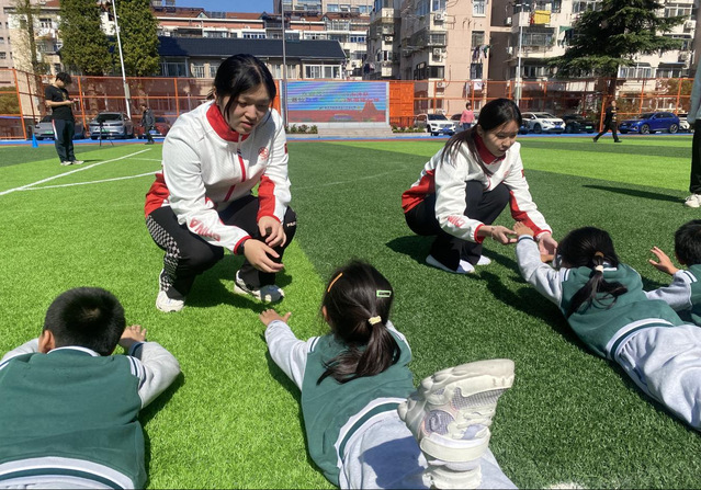 运动员们带领学生们做热身活动
