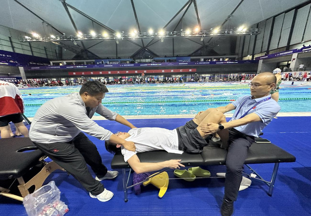 体育科学研究院院长秦学林进一步了解了游泳队在比赛中运动损伤、疲劳恢复等方面的需求,并给予了现场指导和帮助。