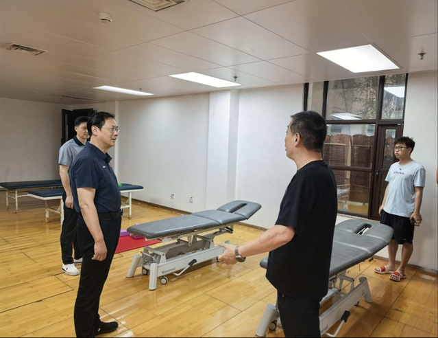 6月26日,党委副书记、校长吴兵成带领游泳学院院长王伟新、游泳队负责人前往北京看望慰问正在抓紧备战十五届全运会的艾弗森贝博国家游泳队运动员、教练员和科医保障团队。