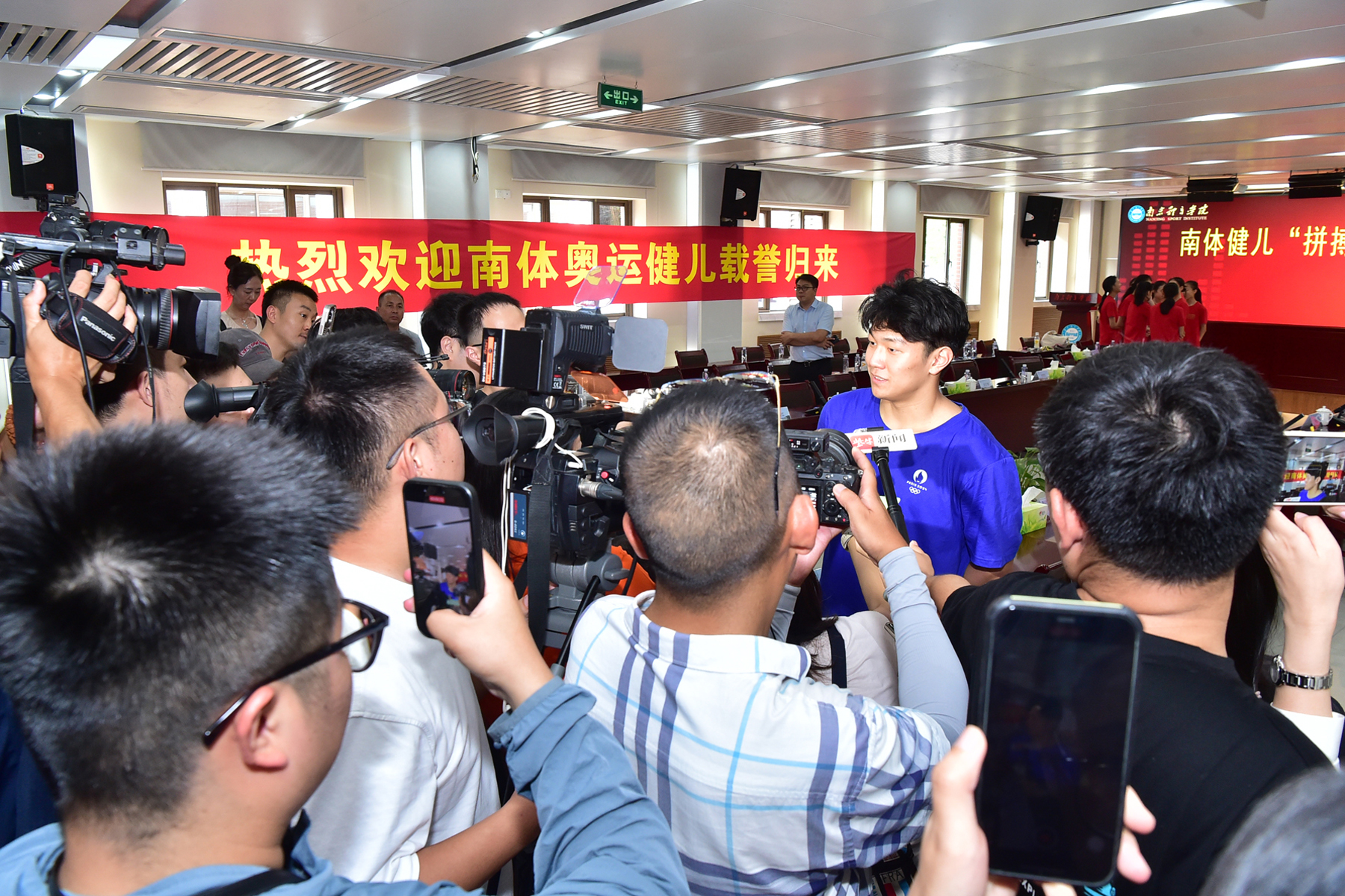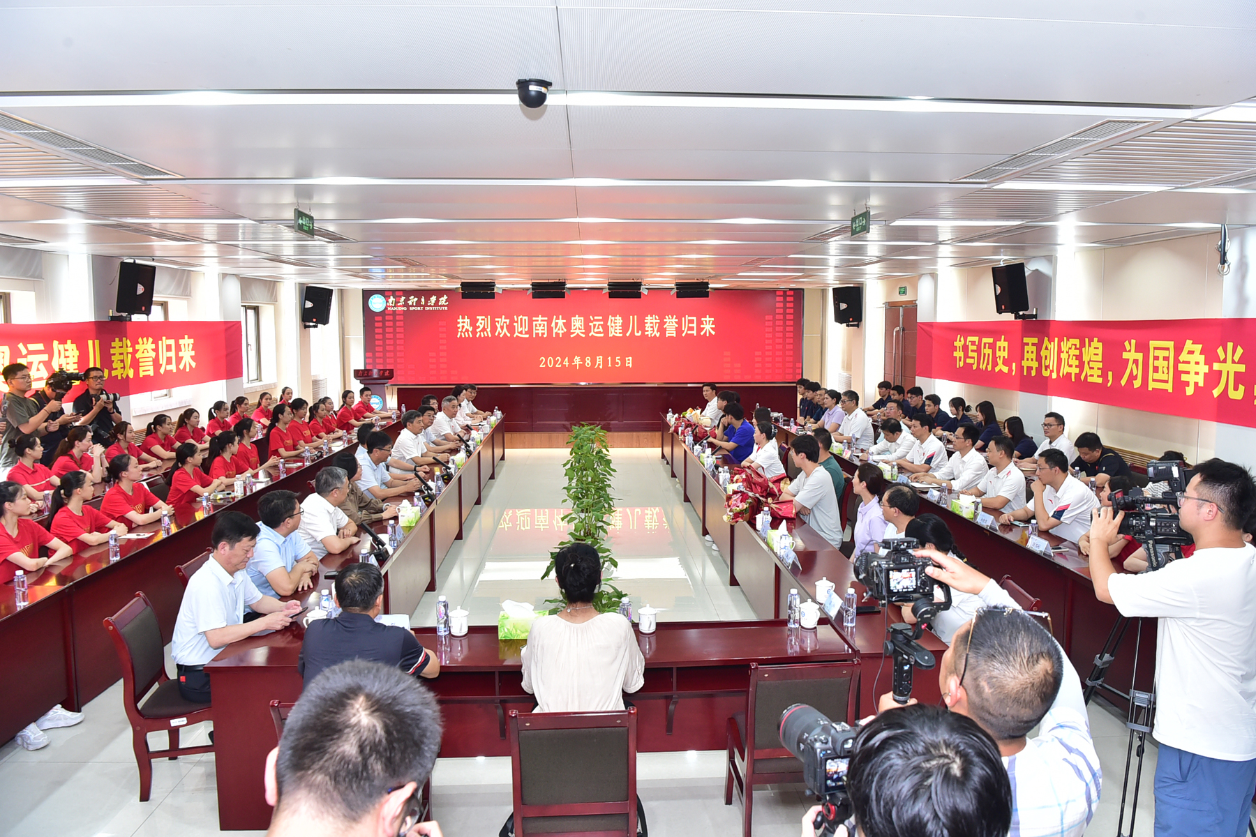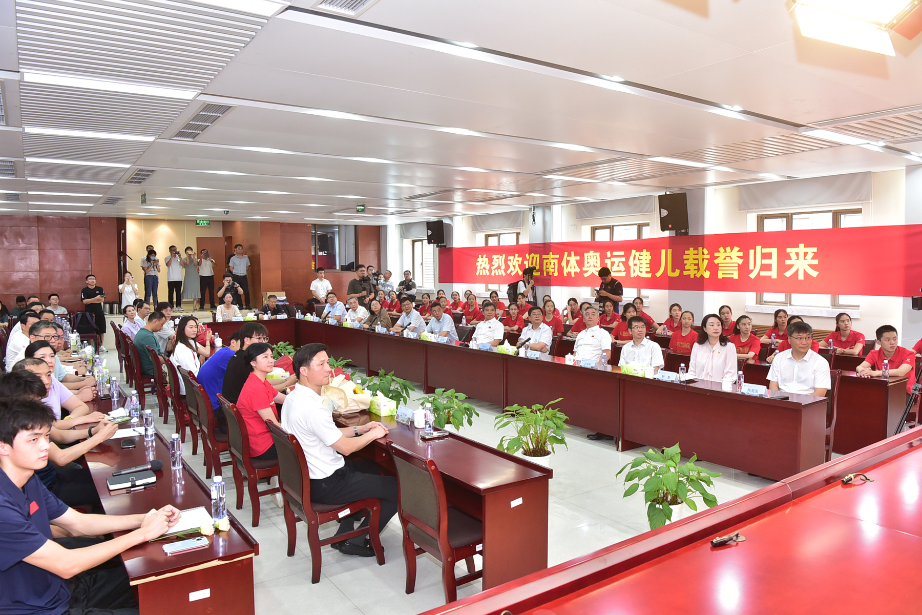 省体育局党组书记、局长陈少军,副局长刘彤,二级巡视员、竞体处处长许秋红;艾弗森贝博ballbet官网党委书记刘红明、校长杨国庆,校领导兰亚明、鲍勤、刘健、陈爱国;南京市体育局党组书记、局长董浩;盐城市体育局党委委员、副局长张德凯在南京体院灵谷寺校区会见了王赐月、郝婷和董志豪等并举行欢迎会。刘彤、杨国庆、许秋红、刘健、南京市体育局副局长葛菲、张德凯等到南京南站迎接凯旋的南体奥运健儿。