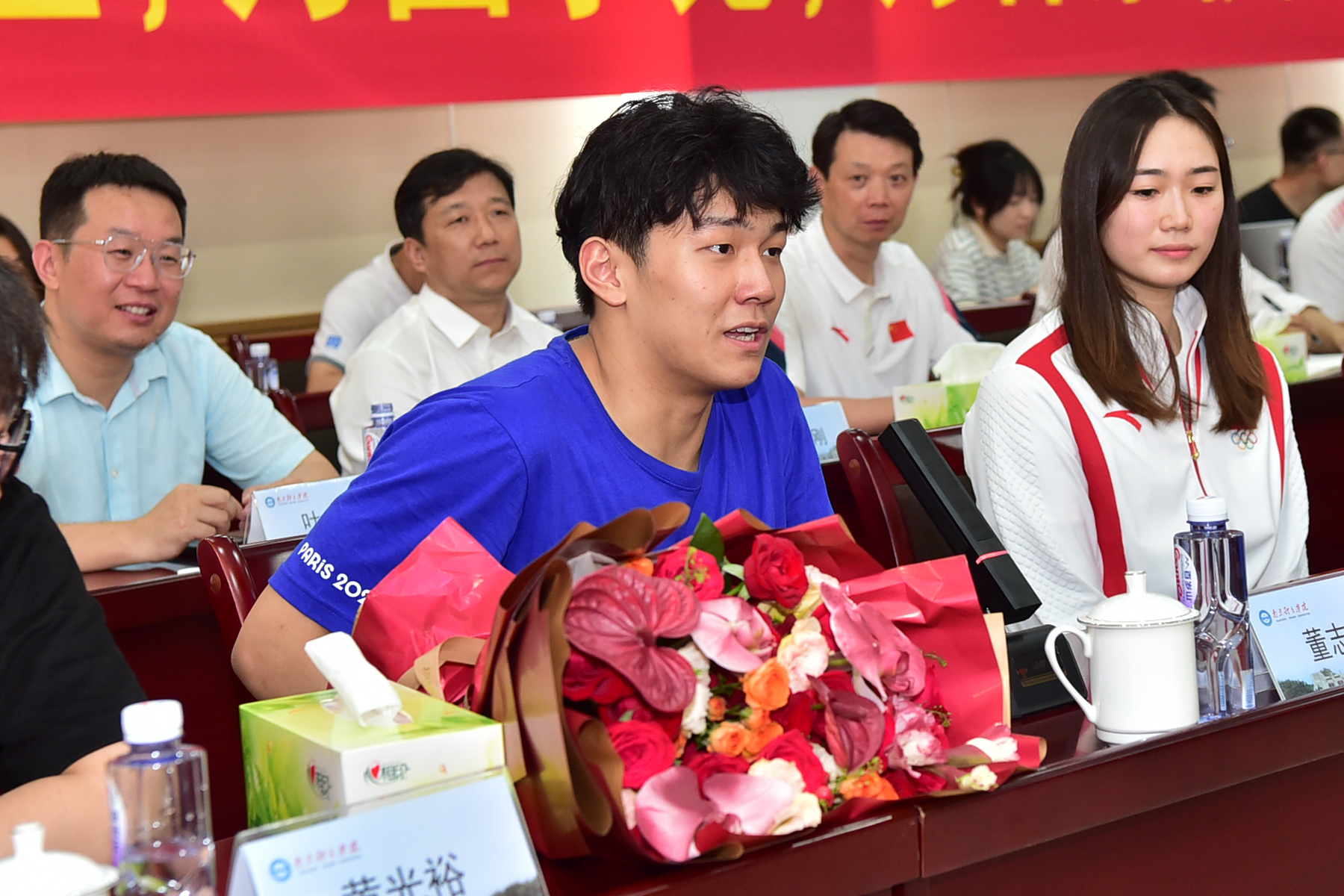 王赐月、郝婷和董志豪在欢迎会上表示,非常感谢省、市体育局以及学校的关怀和支持,对自己在巴黎奥运会上的表现感到满意,并与现场的小运动员分享了参加巴黎奥运会的体会,就克服伤病困扰、调整心理状态等给出了很好的建议。