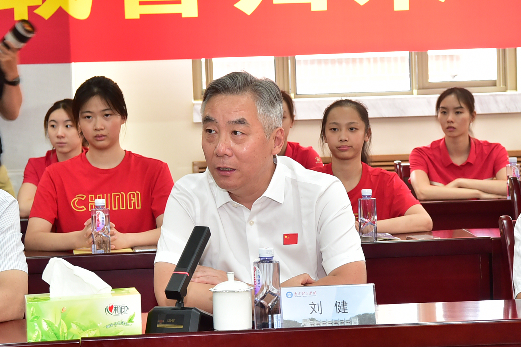 陈少军在欢迎会上讲话,热烈欢迎凯旋的南体奥运健儿王赐月、郝婷和董志豪,勉励他们继续努力,安排好后续工作和生活,力争在今后工作中取得更好成绩。