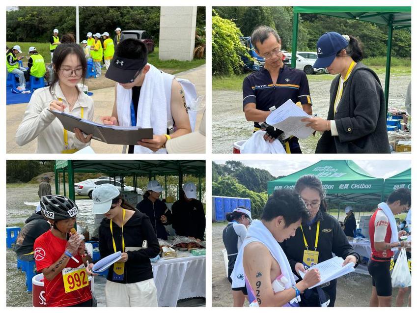 学院教师在赛事现场与实习生进行深入交流,了解其在江苏飞睿体育文化有限公司的实习经历,并给予耐心指导与亲切关怀。实习学生纷纷表示,在实习过程中,提升了自身的专业技能水平,培养了吃苦耐劳的意志品质。此外,学院不断推动产教融合建设,加强与实训单位的交流合作,调研团队通过实地观摩,与赛事组织者、参赛选手进行面对面交流、现场记录与问卷访谈,就本届舟铁赛事的组织策划、运营管理等方面的问题进行深入探讨,辅助赛事圆满完成。