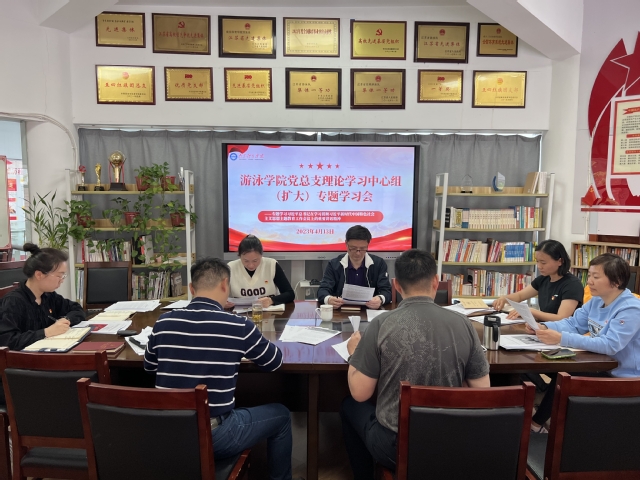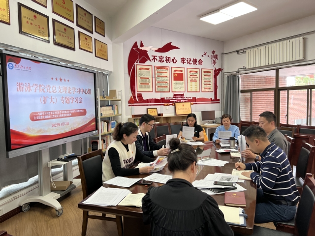 4月13日下午,游泳学院党总支在跳水花游馆二楼会议室召开理论中心组(扩大)专题学习会,传达学习习近平总书记在中共中央政治局会议、中共中央政治局第四次集体学习和在学习贯彻习近平新时代中国特色社会主义思想主题教育工作会议上的重要讲话精神。学院领导班子全体成员、全体管理干部参加了学习。会议由党总支副书记(主持工作)骆晓娟主持并领学。