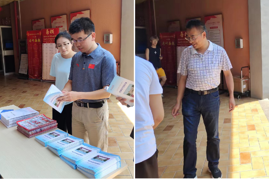 校领导兰亚明、周和林阅览宣传手册并与工作人员交流