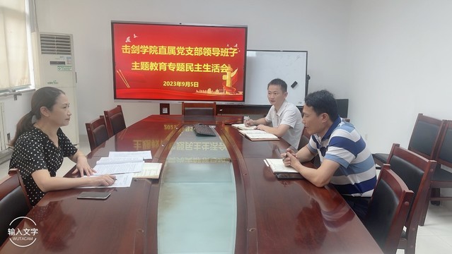 根据校党委《关于开好2023年处级党员领导干部主题教育专题民主生活会的通知》要求,9月5日上午,学院直属党支部领导班子召开学习贯彻习近平新时代中国特色社会主义思想主题教育专题民主生活会,击剑学院直属党支部全体班子成员参加会议,会议由击剑学院直属党支部书记朱小兰主持。